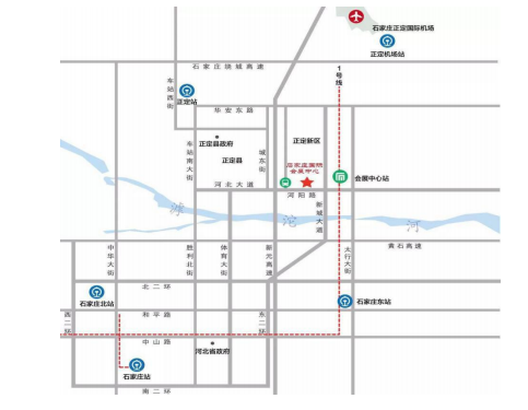 石家莊正定國際機場—石家莊國際會展中心 出租車:距離 40 公里,約 39 分鐘。 公交:機場正定線→金星假日酒店→步行 110m,至乒乓球基地站→乘坐 143 路→大臨濟下車, 步行 900 米至石家莊國際會展中心。